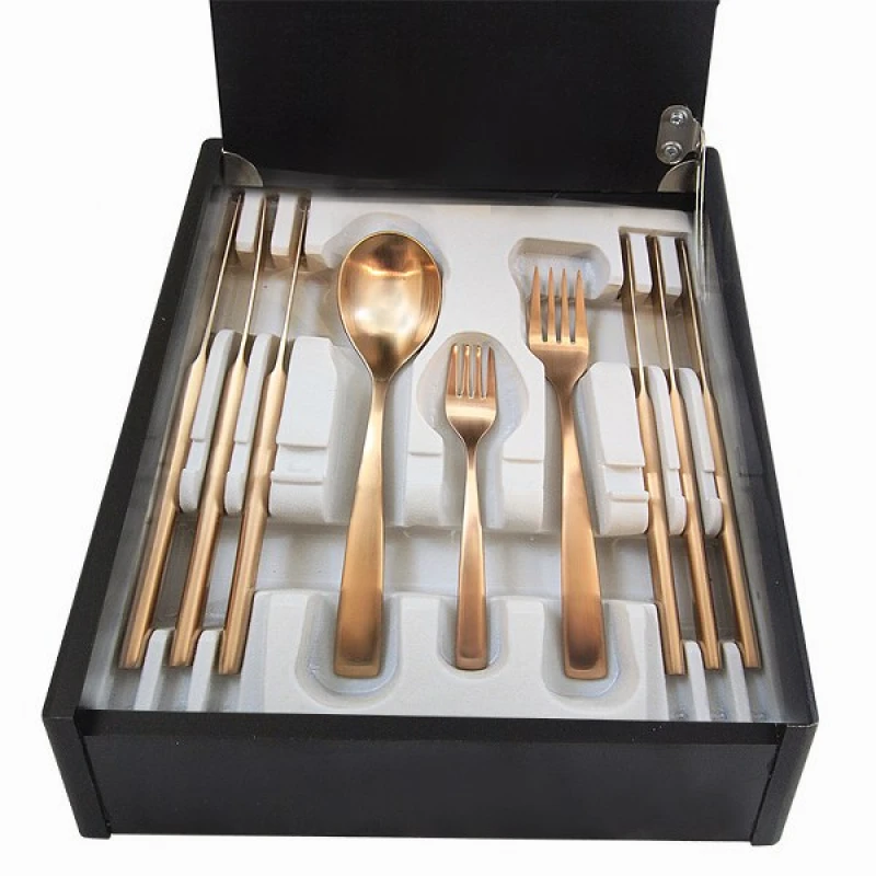 Μαχαιροπήρουνα σετ 24 τεμαχίων ανοξείδωτα σε ξύλινο κουτί, ισπανικής προέλευσης. Το σετ αποτελείται από: 6 πηρούνια φαγητού, 6 κουτάλια φαγητού, 6 μαχαίρια φαγητού, 6 κουτάλια γλυκού.