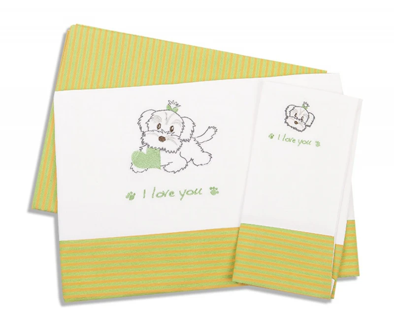 Σετ σεντόνια μπεμπέ 100% βαμβάκι περκάλι,144 κλωστών με κέντημα και φάσα σε λευκό χρώμα με λαχανί -πορτοκαλί ρίγες Σκυλάκι 120 από την Dim Collection. Το σετ περιλαμβάνει: 2 σεντόνια 120x170εκ. και 1 μαξιλαροθήκη 30x40εκ.