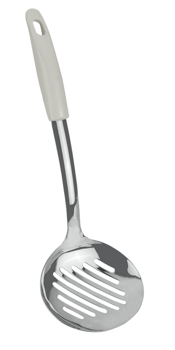 Κουτάλα τρυπητή ανοξείδωτη με λευκή χειρολαβή της σειράς Laguna από την METALTEX.