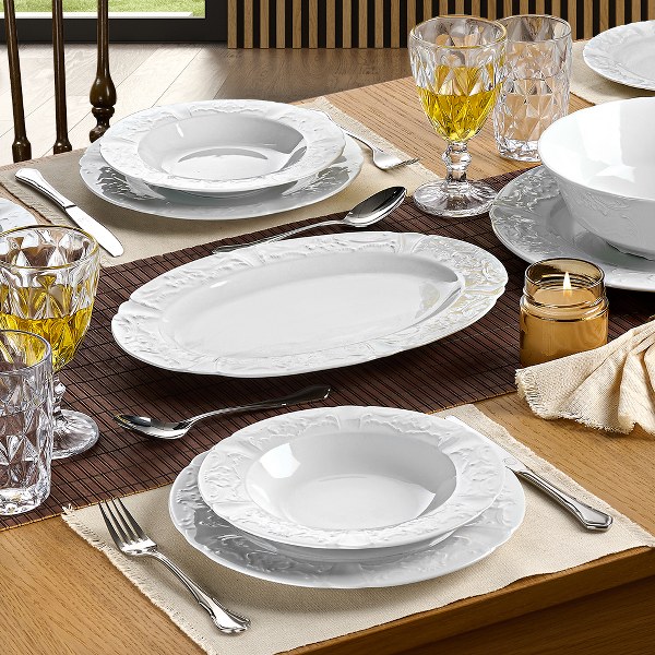 Σερβίτσιο πιάτων 20 τεμαχίων από πορσελάνη της σειράς Regina White από την CRYSPO TRIO. Το σετ περιλαμβάνει: 6 Ρηχά, 6 Βαθιά, 6 Φρούτου, 1 Σαλατιέρα, 1 Πιατέλα.