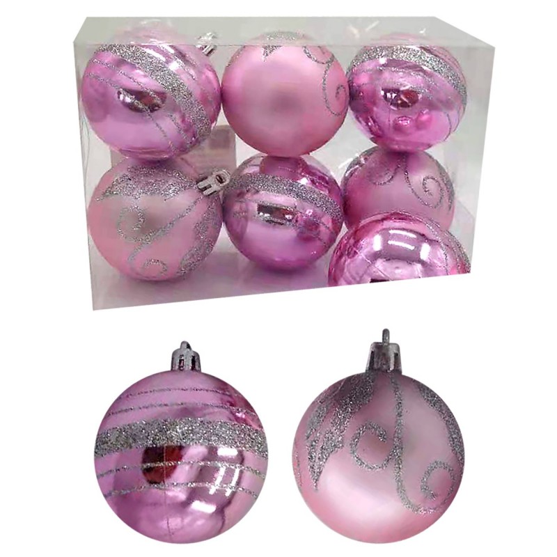 Σετ μπάλες 6τμχ ματ και γυαλιστερές σε ροζ χρώμα με ασημί λεπτομέρειες από την Xmas fest - Διαστάσεις: 6εκ.