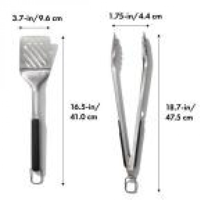 Σετ ψησίματος λαβίδα και σπάτουλα από ανοξείδωτο ατσάλι.Η σπάτουλα διαθέτει φαρδιά και λοξή λαβή ιδανική για να ολισθαίνει κάτω από τα μπιφτέκια. Η λαβίδα περιέχει και ενσωματωμένο ανοιχτήρι. Οι πολύ μεγάλες λαβές κρατούν τα χέρια μακριά από τη θερμότητα και τη φλόγα. Κατάλληλες για πλυντήριο πιάτων από την Oxo - Διαστάσεις: 47εκ., 41εκ.