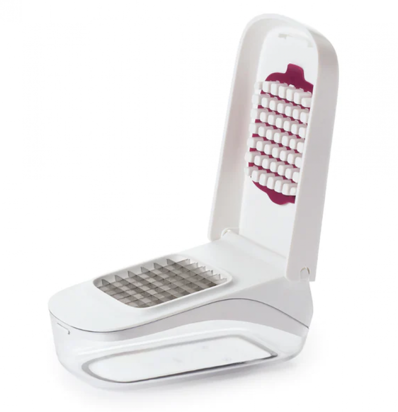 Με τον χειροκίνητος κόφτης λαχανικών Oxo ψιλοκόψτε γρήγορα και με ασφάλεια τα κρεμμύδια, τις πιπεριές και άλλα φρούτα και λαχανικά με μία εύκολη κίνηση, αποθηκεύοντας τα στο ειδικό δοχείο που διαθέτει. Το σχέδιο λεπίδας από ανοξείδωτο ατσάλι και η εσοχή περιοχή κοπής κρατούν τα τρόφιμα στη θέση τους, ενώ το καπάκι διαθέτει και μοχλό για αποτελεσματικό τεμαχισμό.