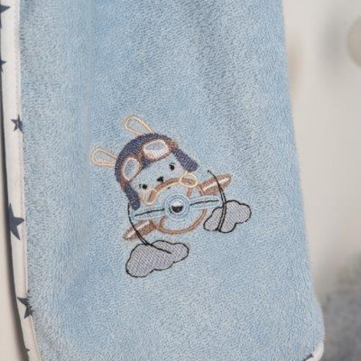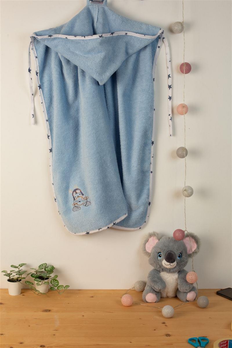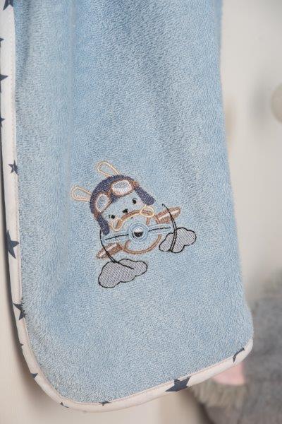 Κάπα μπεμπέ 100% βαμβακερή υψηλής απορροφητικότητας, 400gsm σε σιέλ χρώμα με κουκούλα και κέντημα από την DimCol - Διαστάσεις: 75x85εκ.