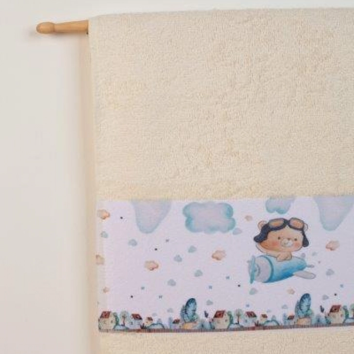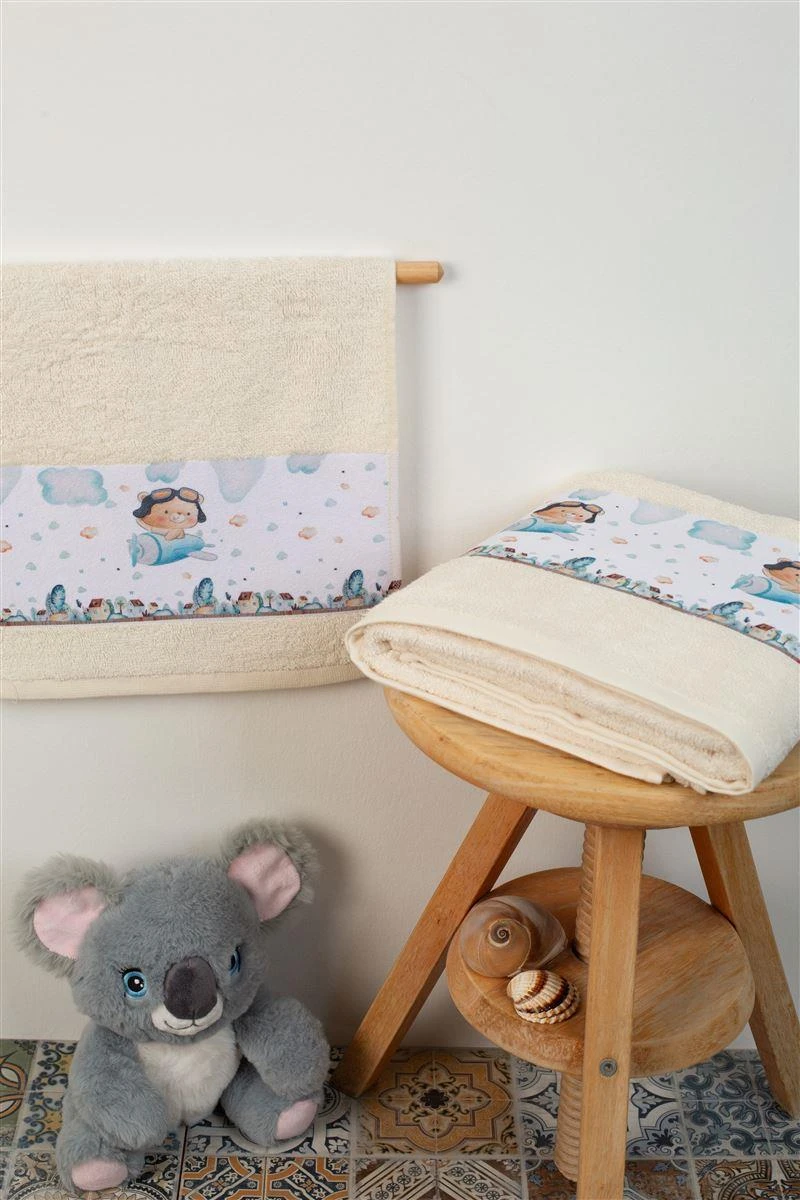 Σετ πετσέτες μπεμπέ 2τμχ υψηλής απορροφητικότητας με φάσα και ψηφιακά τυπώμένο χρωματιστό σχέδιο, 100% βαμβακερές 400gsm σε εκρού χρώμα από την DimCol - Το σετ περιλαμβάνει: 1 πετσέτα 30x50εκ. και 1 πετσέτα 70x140εκ.