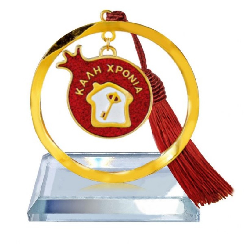 Επιτραπέζιο γούρι ρόδι με σπιτάκι σε κρυστάλλινη βάση σε χρυσό - κόκκινο χρώμα από την Xmas fest.