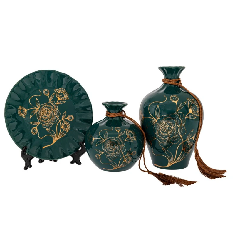 Διακοσμητικά επιτραπέζια σετ 3τμχ κεραμικά σε πετρόλ με σχέδιο λουλούδια από την iliadis - Διαστάσεις: 14x14x22εκ.-13x13x15εκ.-20x2x20εκ.