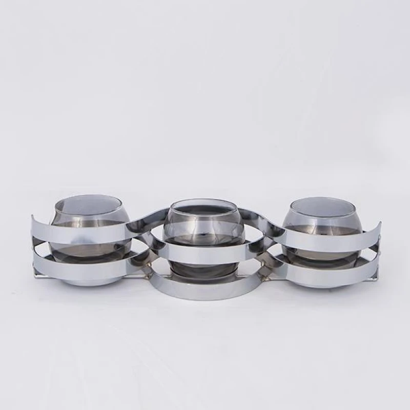 Κηροπήγιο 3 θέσεων μεταλλικό σε ασημί χρώμα με γυάλινα γκρι δοχεία από την ESTHETI - Διαστάσεις: 33,5x10x8εκ.