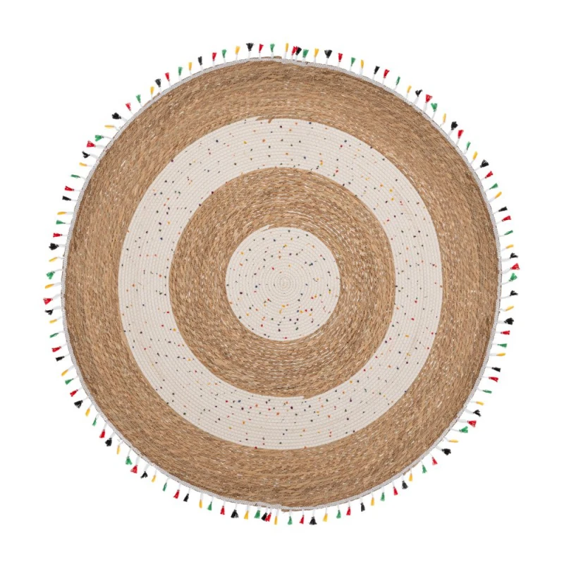 Χαλί στρογγυλό boho style απο γιούτα και βαμβάκι σε χρώμα καφέ natural-μπεζ και πολύχρωμα κρόσσια από την iliadis - Διαστάσεις: 100εκ.