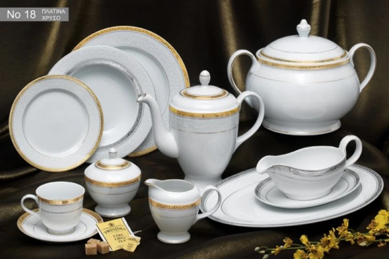Σερβίτσιο πιάτων 20τμχ από πορσελάνη Bavaria Γερμανίας σε λευκό χρώμα με χρυσές λεπτομέρειες. Το σετ περιλαμβάνει: 6 ρηχά, 6 βαθιά, 6 φρούτου, 1 σαλατιέρα και 1 πιατέλα. (Διατίθενται και φλυτζάνια τσαγιού)