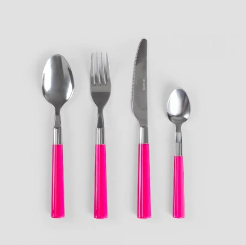 Σετ μαχαιροπίρουνα 16τμχ ανοξείδωτα ασημί με φούξια πλαστική λαβή, της σειράς Seashell από την Homla - Το σετ αποτελείται από: 4 πηρούνια φαγητού, 4 κουτάλια φαγητού, 4 μαχαίρια φαγητού, 4 κουτάλια γλυκού.