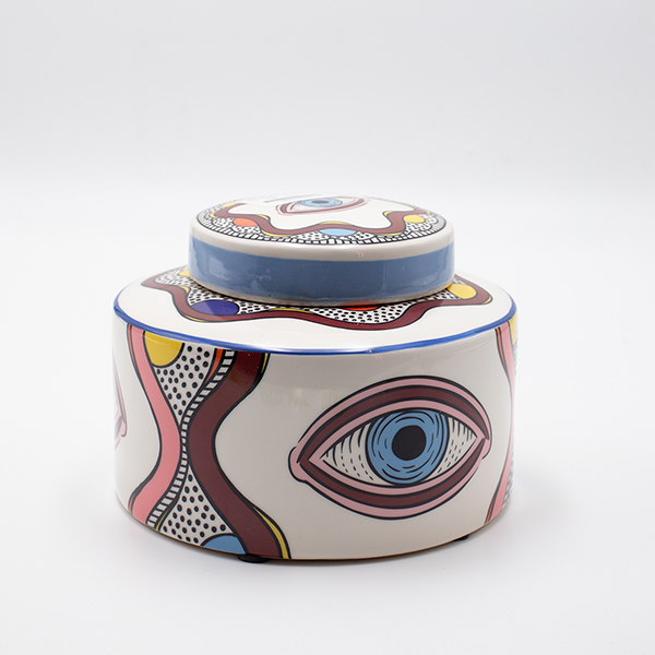 Διακοσμητικό μπωλ με καπάκι κεραμικό σε λευκό χρώμα με πολύχρωμα σχέδια και γαλάζια μάτια από την ESTHETI - Διαστάσεις: 16x16x12,3εκ.