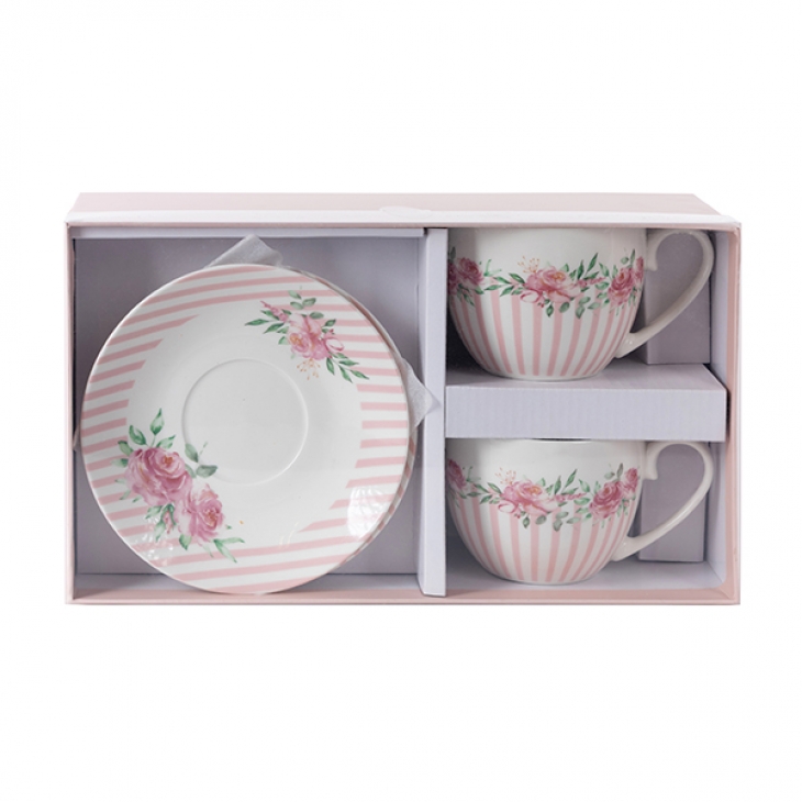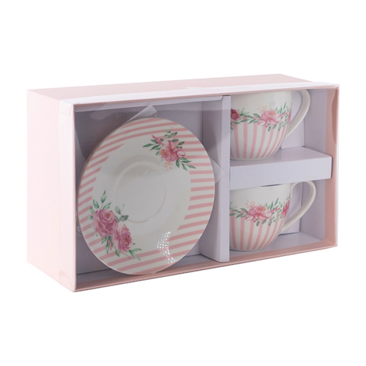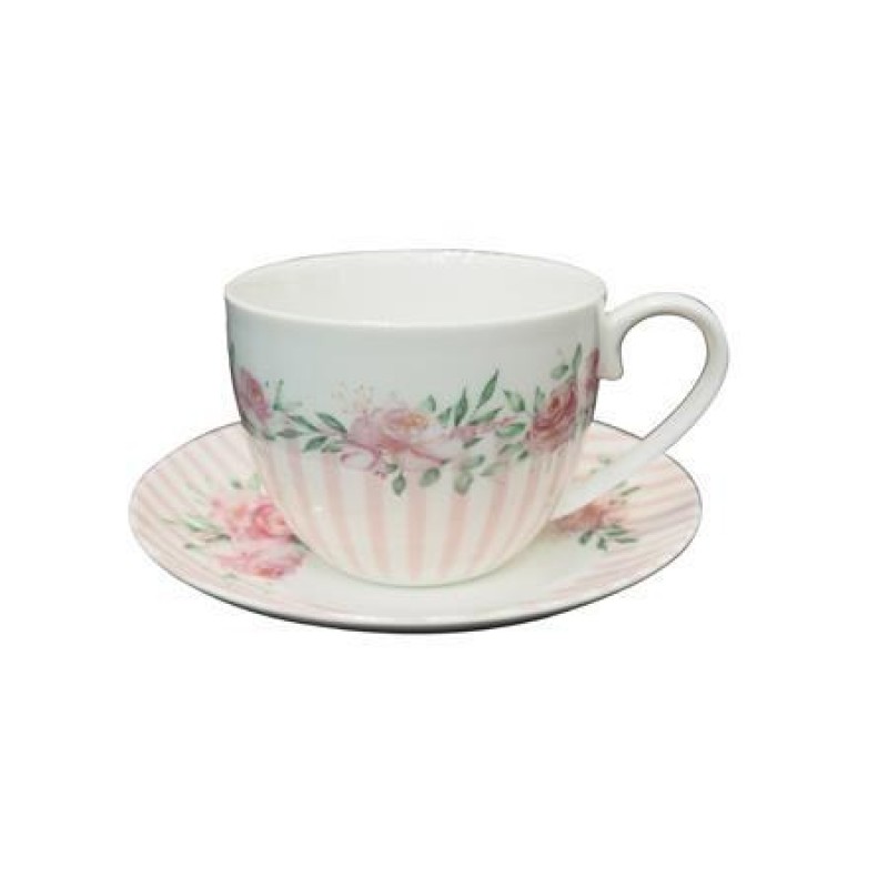 Σετ 2τμχ φλυτζάνι τσαγιού με πιατάκι, πορσελάνης σε λευκό - ροζ χρώμα με σχέδιο ανθάκια από την ESTHETI - Χωρητικότητας: 230ml.