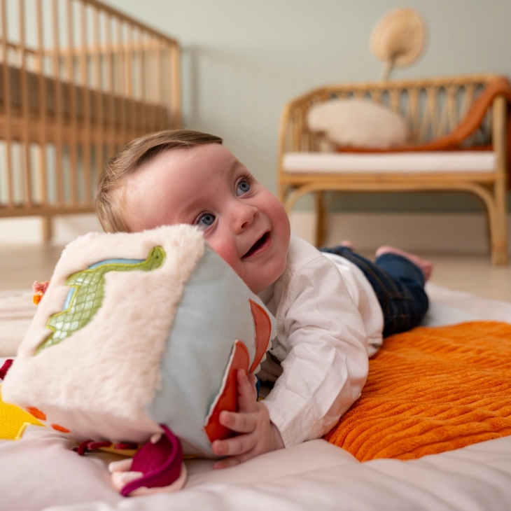Ο μαλακός αυτός κύβος ενθαρρύνει τον συντονισμό χεριού-ματιού και τις κινητικές δεξιότητες του παιδιού. Συμπεριλαμβάνεται κουδουνίστρα, τσαλακωτά υφάσματα και ένας καθρέφτης για να ανακαλύψει την αντανάκλασή του.