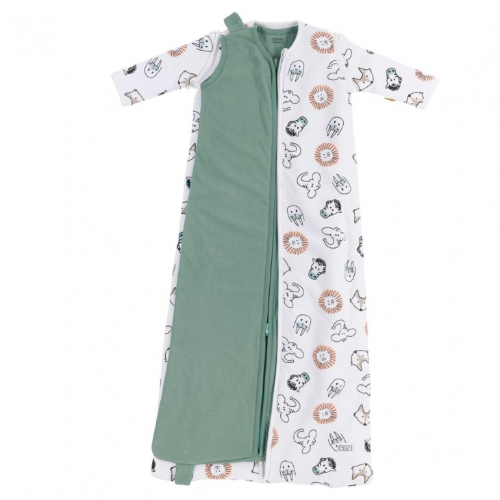 Διπλώνοντας το κάτω μέρος του και στερεώνοντάς τον με τα ενσωμετωμένα του κουμπάκια, ο υπνόσακος ρυθμίζεται σε μέγεθος. Αυτό σημαίνει ότι αυτός ο υπνόσακος μπορεί να χρησιμοποιηθεί για χρόνια και μπορεί να φορεθεί από 6 μηνών έως και 3 ετών. Οι δύο υπνόσακοι αποτελούνται από έναν εξωτερικό υπνόσακο με επένδυση με αποσπώμενα μανίκια και έναν εσωτερικό.