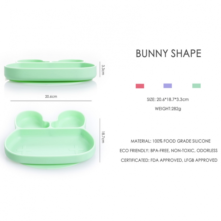 Το Πιάτο σιλικόνης κουνελάκι με χωρίσματα είναι το απόλυτο πιατάκι φαγητού! Το Πιάτο σιλικόνης κουνελάκι με χωρίσματα είναι το ιδανικό πιάτο από την αρχή των στέρεων τροφών και για τα επόμενα χρόνια. Η βεντούζα στη βάση του κρατάει το πιάτο σταθερό και δεν υπάρχει φόβος να γυρίσει ανάποδα!