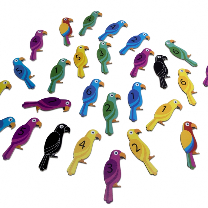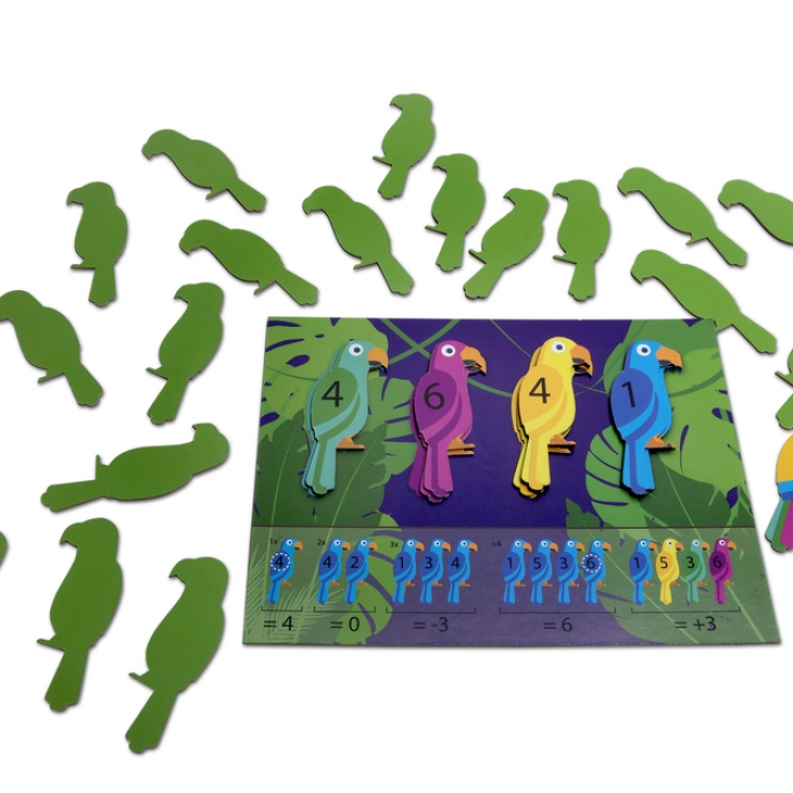 Αυτό το εξωτικό παιχνίδι περιλαμβάνει 28 πανέμορφους χρωματιστούς παπαγάλους και 4 μεγάλες κάρτες υπολογισμού και τοποθέτησης.
