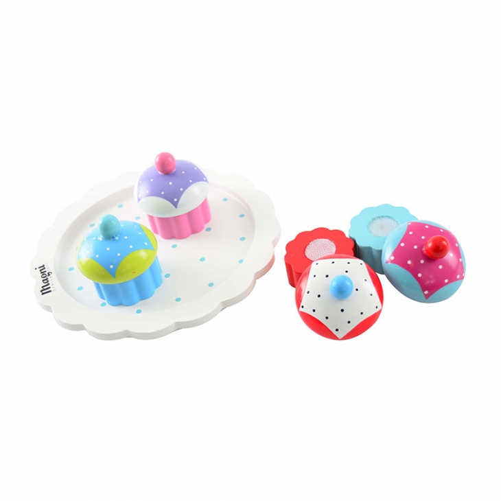 Όλα τα cupcakes χωρίζονται στα δύο με velcro για να μπορεί το μικρό σας να φτιάχνει τους αγαπημένους του συνδυασμούς! Ο ξύλινος πουά δίσκος θα βοηθήσει να αναδειχτούν καλύτερα οι δημιουργίες τους!
