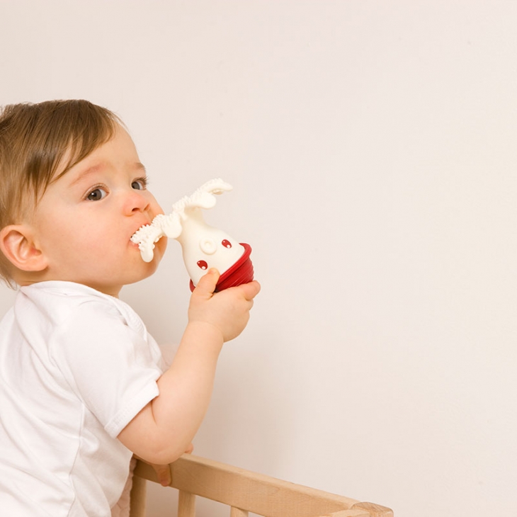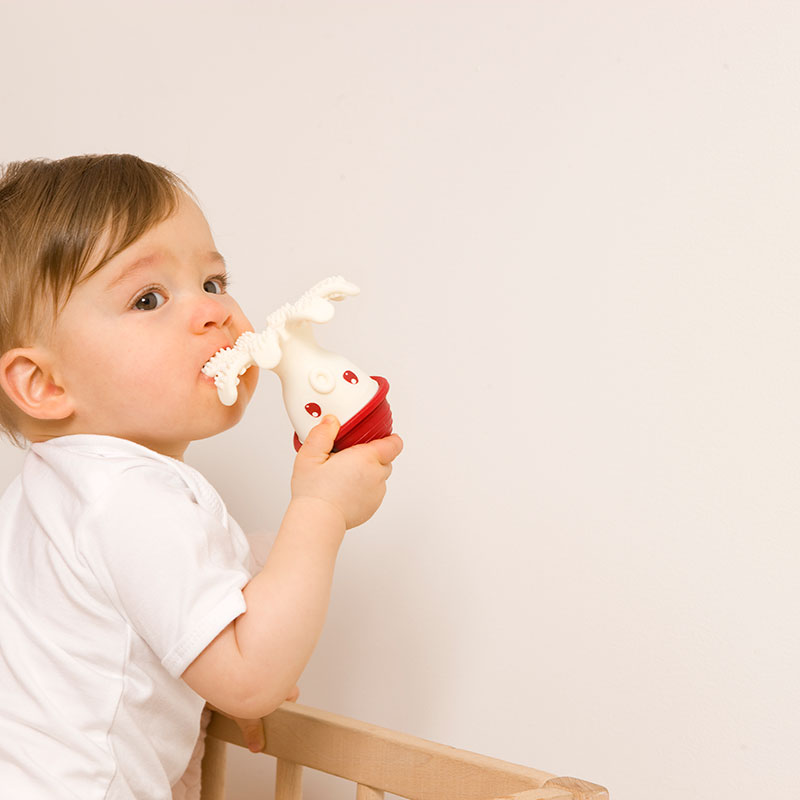Κατασκευασμένο από σιλικόνη κατάλληλη για τρόφιμα, με εναλλαγές στην υφή της επιφάνειας για να μπορεί να τρίψει τα ούλα του και να βρει και μόνο του το σημεία που θα το ανακουφίσουν από τον πόνο και τη φαγούρα.