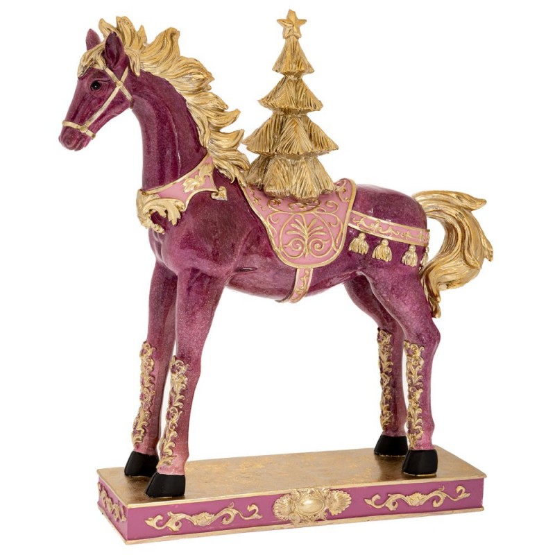 Χριστουγεννιάτικο διακοσμητικό άλογο polyresin σε ροζ χρώμα με χρυσές λεπτομέρειες, χαίτη και δεντράκι από την iliadis - Διαστάσεις: 30x9x34εκ.