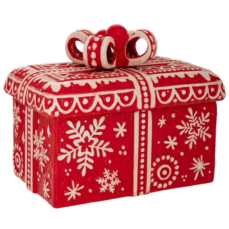 Χριστουγεννιάτικη μπισκοτιέρα κεραμική σε σχήμα δώρου σε κόκκινο - λευκό χρώμα από την iliadis - Διαστάσεις: 21x15x18εκ.