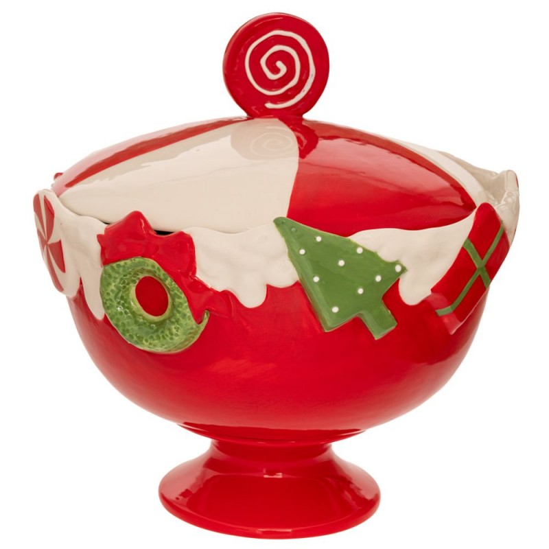 Χριστουγεννιάτικη μπισκοτιέρα κεραμική με σχέδιο καραμέλα σε λευκό - κόκκινο χρώμα από την iliadis - Διαστάσεις: 22x22x24εκ.