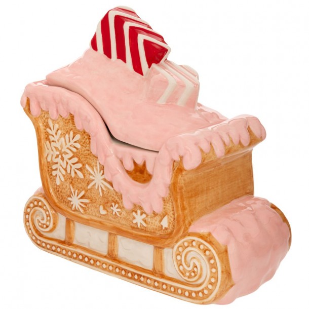 Χριστουγεννιάτικη μπισκοτιέρα κεραμική gingerbread σε σχήμα έλκηθρου σε καφέ - ροζ χρώμα από την iliadis - Διαστάσεις: 25x13x24εκ.