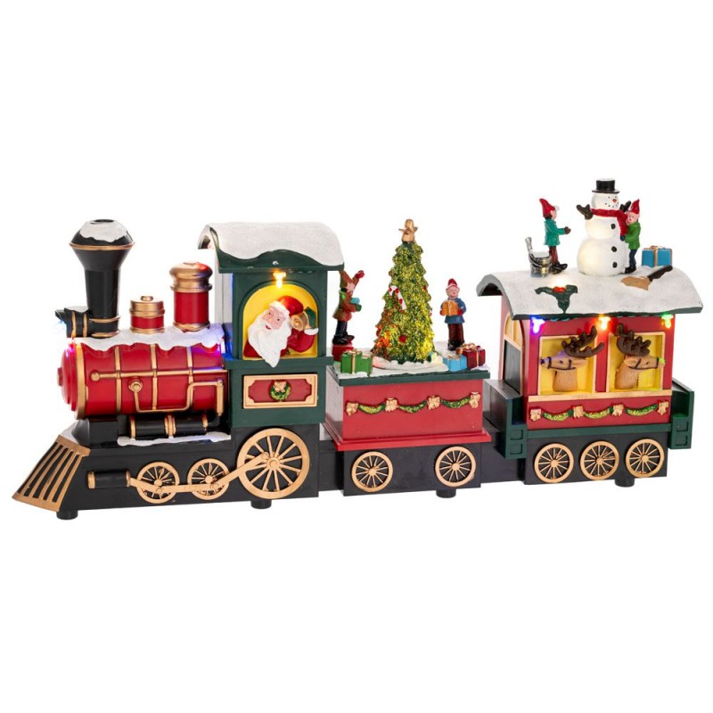 Χριστουγεννιάτικο εντυπωσιακό φωτιζόμενο τρένο με τον Άγιο Βασίλη στην θέση του οδηγού. Στα υπόλοιπα βαγόνια είναι τοποθετημένα ξωτικά με δώρα. Το τρένο κινείται, έχει φωτάκια και παίζει μουσική, για την οποία έχει κουμπι on/off. Λειτουργεί με ρεύμα με μετασχηματιστή 4.5V που περιέχεται. Υλικό κατασκευής πολυρεζίνη και πλαστικό. Πολύ καλή απεικόνιση και ποιότητα κατασκευής. Τo προιόν μπορεί να έχει μικρές χρωματικές διαφορές απο την φωτογραφία.