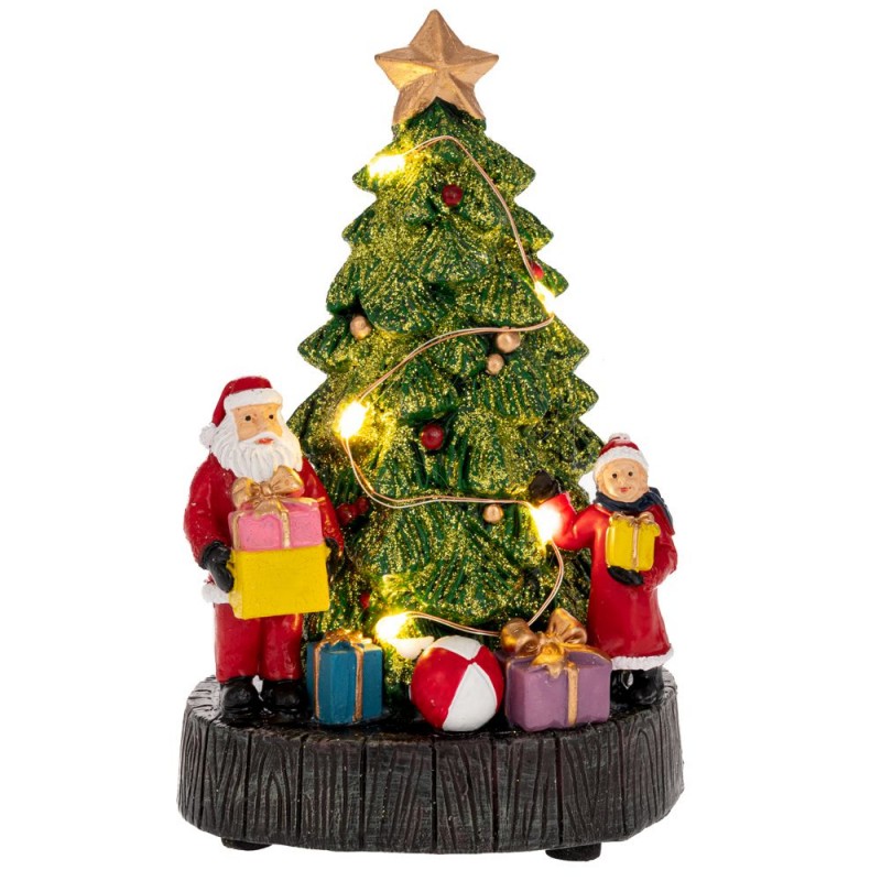 Χριστουγεννιάτικο στολισμένο δέντρο με Led φωτάκια πάνω σε καφέ βάση. Δίπλα στέκεται ο Άγιος Βασίλης που κρατάει δώρα. Λειτουργεί με 2 μπαταρίες ΑΑΑ, οι οποίες δεν περιέχονται.