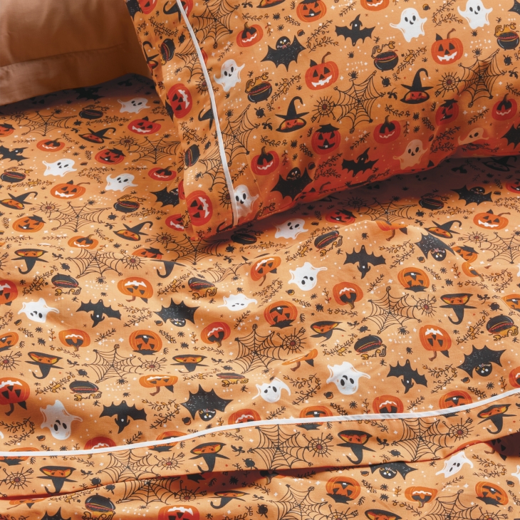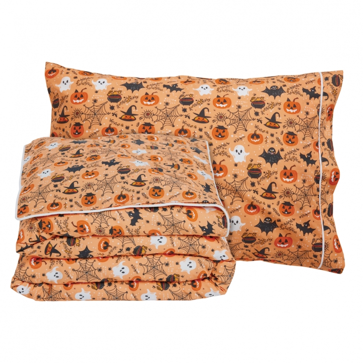 Σετ σεντόνια της σειράς Kid, σε σχέδιο Halloween. Είναι από 70% υποαλλεργικό βαμβάκι και 30% πολυεστέρα με πυκνότητα ύφανσης 150 TC, απαλό στην αφή & ανθεκτικό στη χρήση. Το σετ περιλαμβάνει ένα πανωσέντονο 170Χ260εκ, ένα κατωσέντονο 170X260εκ και μία μαξιλαροθήκη 50x70εκ. Das home...makes your house a home!