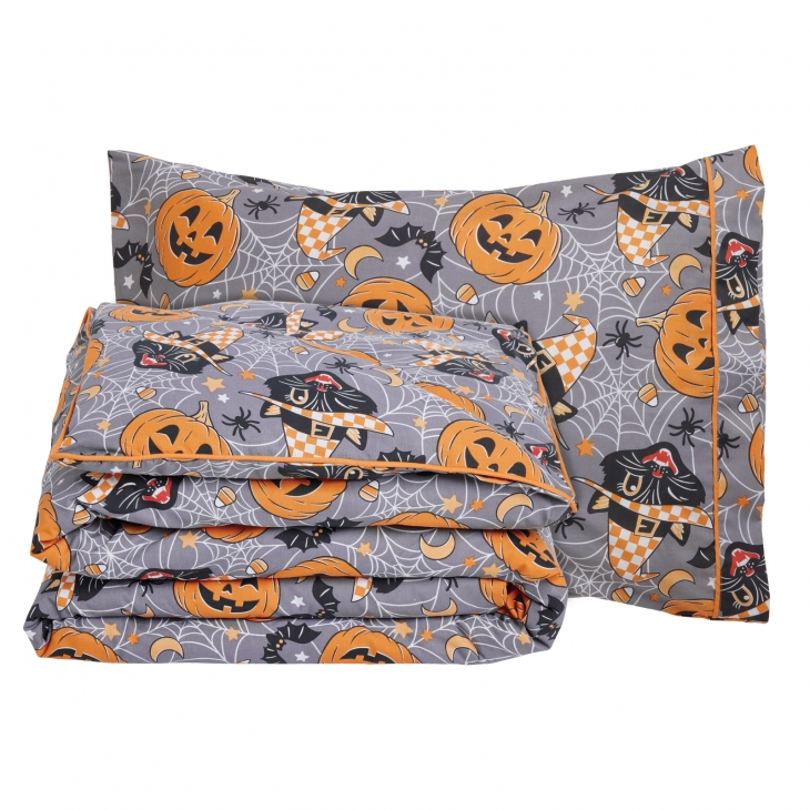 Σετ παπλωματοθήκη της σειράς Kid, σε σχέδιο Halloween. Είναι από 70% υποαλλεργικό βαμβάκι και 30% πολυεστέρα με πυκνότητα ύφανσης 150 TC, απαλή στην αφή, ανθεκτικό στη χρήση και με ειδική επεξεργασία για εύκολο σιδέρωμα. Το σετ περιλαμβάνει μία παπλωματοθήκη διάστασης 160Χ240εκ και μία μαξιλαροθήκη 50Χ70εκ. Das home...makes your house a home!