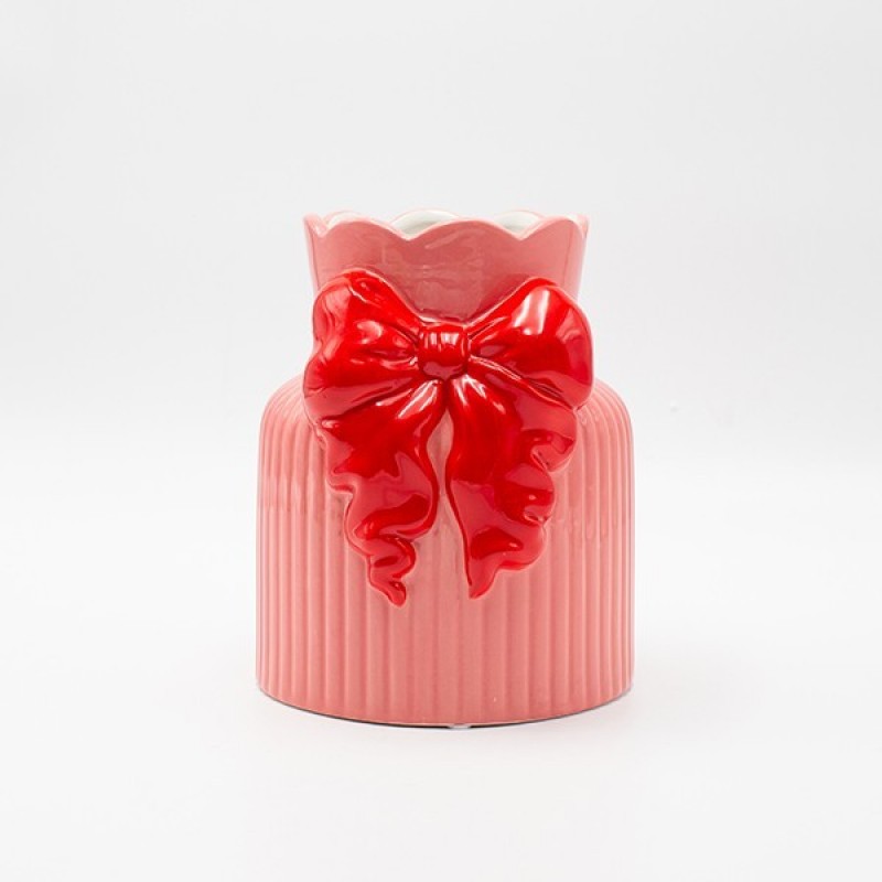Βάζο κεραμικό σε ροζ χρώμα με κόκκινο φιόγκο από την ESTHETI - Διαστάσεις: 14,5x14x17,2εκ.