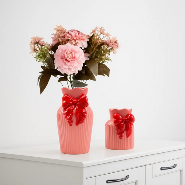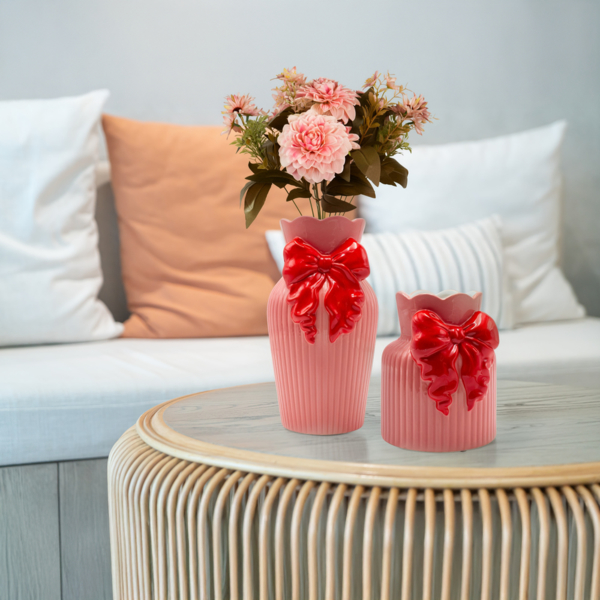 Βάζο κεραμικό σε ροζ χρώμα με κόκκινο φιόγκο από την ESTHETI - Διαστάσεις: 14,5x14x17,2εκ.