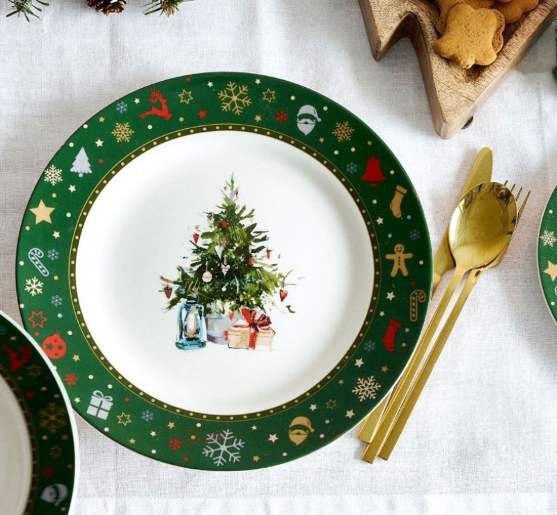 Χριστουγεννιάτικο σερβίτσιο φαγητού σετ 18τμχ πορσελάνης σε πράσινο χρώμα με μοτίβο χριστουγεννιάτικο δέντρο από την Homla. Το σετ περιλαμβάνει: 6 πιάτα ρηχά φαγητού 27εκ., 6 πιάτα βαθιά 22εκ. και 6 πιάτα φρούτου 19εκ.