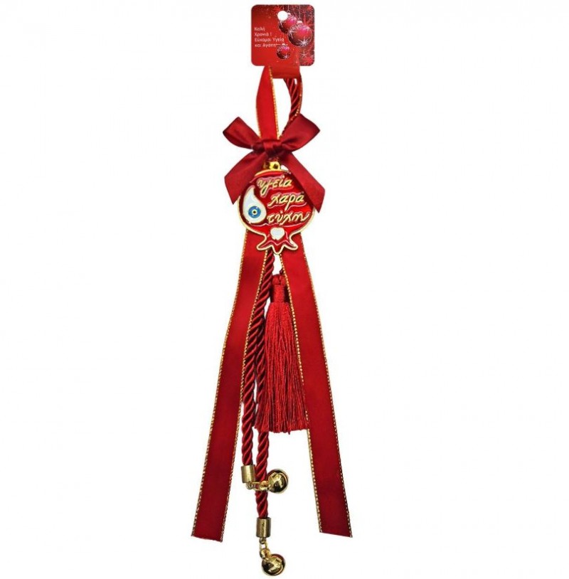 Γούρι με κρεμαστό ρόδι με ευχές μεταλλικό με κορδέλες, σκοινί και φούντα σε κόκκινο - χρυσό χρώμα από την Xmas fest - Διαστάσεις:30εκ. - Η ελάχιστη ποσότητα αγοράς για αυτό το προϊόν είναι 12τμχ.