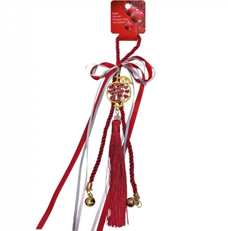 Γούρι με κρεμαστό ρόδι με πέτρες, μεταλλικό με κορδέλες, σκοινί και φούντα σε κόκκινο - χρυσό χρώμα από την Xmas fest - Διαστάσεις:30εκ. - Η ελάχιστη ποσότητα αγοράς για αυτό το προϊόν είναι 12τμχ.