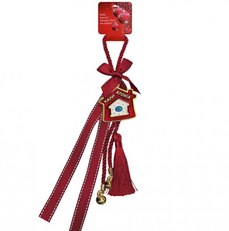 Γούρι με κρεμαστό σπίτι - καλή χρονιά μεταλλικό με κορδέλες, σκοινί και φούντα σε κόκκινο - χρυσό χρώμα από την Xmas fest - Διαστάσεις:30εκ. - Η ελάχιστη ποσότητα αγοράς για αυτό το προϊόν είναι 12τμχ.