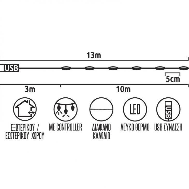 Λαμπάκια 200 Led με θερμό λευκό φως, USB σύνδεση με controller 8 προγράμματων, διάφανο καλώδιο 13μ. από την Xmas fest.