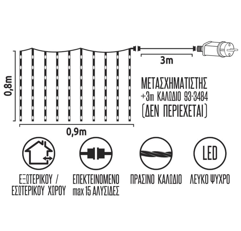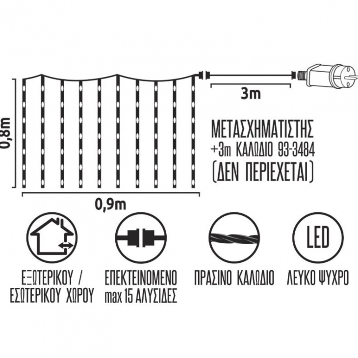 Λαμπάκια - κουρτίνα 100 Led-90x80εκ. με ψυχρό λευκό φως, επεκτεινόμενα (σύνδεση max 15 σειρές) και 8 προγράμματα, για εσωτερικό και εξωτερικό χώρο με πράσινο καλώδιο από την Xmas fest. Δεν περιέχεται ο μετασχηματιστής. Ο μετασχηματιστής που εφαρμόζει είναι το προιόν με κωδικό 93-3484