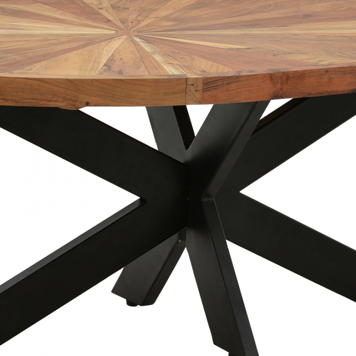 - Μοναδικός Σχεδιασμός: Η οβάλ επιφάνεια από μασίφ ξύλο, με το εντυπωσιακό ακτινωτό μοτίβο, προσδίδει μια αίσθηση ζεστασιάς και εκλεπτυσμένης ρουστίκ κομψότητας. Κάθε τραπέζι είναι μοναδικό, με τους φυσικούς κόκκους του ξύλου να αφηγούνται τη δική τους ιστορία.