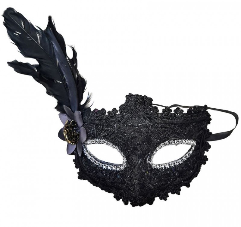 Μάσκα κοκκάλινη σε μαύρο - μωβ χρώμα με φτερό και δαντέλα από την Carnavalista - Διαστάσεις: 19x22εκ.