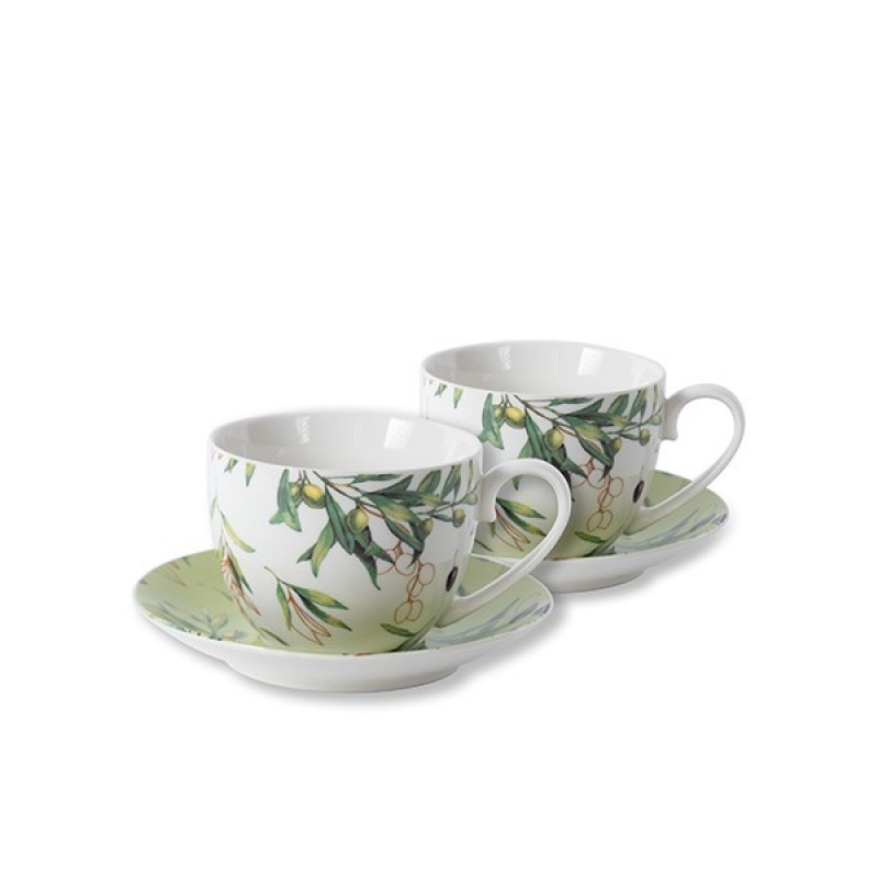 Σετ 2τμχ φλυτζάνι τσαγιού με πιατάκι, πορσελάνης σε λευκό - πράσινο χρώμα με σχέδιο κλαδιά ελιάς από την ESTHETI - Χωρητικότητας: 230ml.